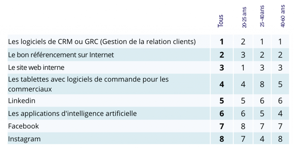 Il convient de préciser qu’à la rédaction du Petit Sarthois, nous avancions dans l’inconnu… Il fallait définir 8 réponses déjà… Choisir 8 outils de manière subjective, qui ne sont pas physiques tant le fait de mentionner le smartphone il n’y aurait pas eu débat… Comment faire aujourd’hui pour travailler sans smartphone ? Pas de mails, pas de Waze, j’en passe…Donc dans nos 8 réponses à hiérarchiser de 1 à 8, les logiciels de CRM (ou GRC) arrivent en tête. La CRM c’est quoi ? C’est un logiciel qui centralise toutes les informations clients : coordonnées, noms des décideurs, notes de synthèse des rendez-vous, commandes, factures, etc… CRM est un anglicisme signifiant Customer Relationship Management (Gestion de la Relation Client). Autant dire l’historique de clientèle qui permet de faire fructifier le passé au présent et vers l’avenir. Les 2 panels les plus âgés placent le CRM en tête, quand les plus jeunes les placent en n°2, mettant en n°1 le site web interne. Les plus expérimentés placent même le bon référencement sur Internet devant le site web, sous-entendu le plus important c’est qu’on parle de nous, comme en politique… lol. Autre outil qui fait une belle percée : les tablettes numériques de commande pour les commerciaux, arrivé en n°4 chez les jeunes et en n°5 chez les 40-60 ans. Les directeurs de magasins placent plutôt Instagram en n°4, on peut le comprendre car pas besoin de tablette numérique pour vendre, c’est directement en boutique. A noter d’ailleurs que concernant les réseaux sociaux, Linkedin est plébiscité sans surprises, le commerce hors magasin (panels des jeunes et des chefs d’entreprises) privilégiant les réseaux sociaux en B to B, ce qui semble normal. Facebook arrive dernier pour les jeunes et avant dernier pour les autres, ce réseau social ne semblant pas séduire vraiment quand il s’agit de trouver des clients.Enfin, nous avions proposé les applications d’IA, elles arrivent quand même en n°6, de plus en plus de jeunes l’utilisent pour tout aujourd’hui, même pour fixer des prix de vente ou pour faire des mails à son patron…