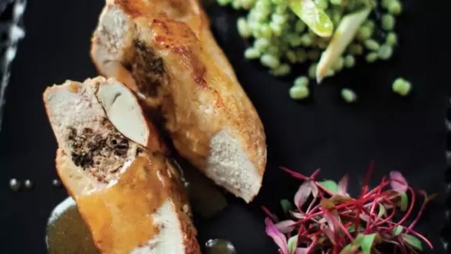 Volaille : Ouvrir chaque volaille dans l’épaisseur, pour créer comme une poche. Garnir avec la farce qu’on aura laissé tiédir un petit peu. Refermer cette poche avec le cure-dent. Saler et poivrer l’extérieur de notre suprême. Faire chauffer l’huile neutre dans une poêle. Saisir les suprêmes à feu vif pour bien saisir la peau. C’est ce qui va permettre à la farce de bien tenir. Cuire chaque face environ 3 à 4 minutes à obtenir une belle coloration. Terminer la cuisson pendant 10 à 12 minutes au four, tranquillement à 180 degrés. De préférence en chaleur tournante. Sinon descendre à 170 degrés. Laisser reposer 5 minutes avant de servir. Accompagnement possible : purée de céleri, polenta crémeuse et haricots verts croquants. Servi avec un Saumur Champigny disponible au Vigo (voir photo ci-contre).