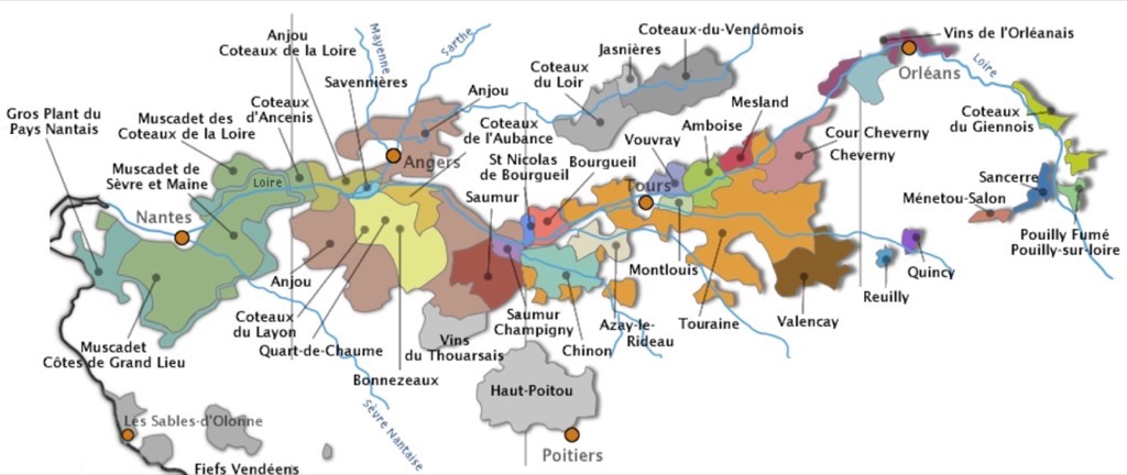 Les vins de Loire constituent un patrimoine de premier plan pour notre région. Comme le rappelle notre hôte «Les vins de Loire offrent une richesse et une diversité incroyables. Que vous soyez amateur de blancs secs, de rouges fruités ou de bulles raffinées, vous trouverez forcément un vin qui vous plaît.» Les vignobles ne sont pas hiérarchisés – contrairement à la Bourgogne, et ils ne subissent pas de classement historique, comme c’est le cas à Bordeaux. Il n’est donc pas facile dans cette région viticole de trouver les meilleurs producteurs. Les vins sont donc divers, mais souvent de qualité et à prix abordables. Les cépages utilisés sont très divers. On trouve par exemple le cabernet franc et le gamay pour les rouges. Pour les vins blancs le chenin est largement utilisé, viennent ensuite le sauvignon qui exprime toute sa puissance dans le Centre, et un peu de chardonnay. Les appellations sont réparties par département et sont très diverses.
